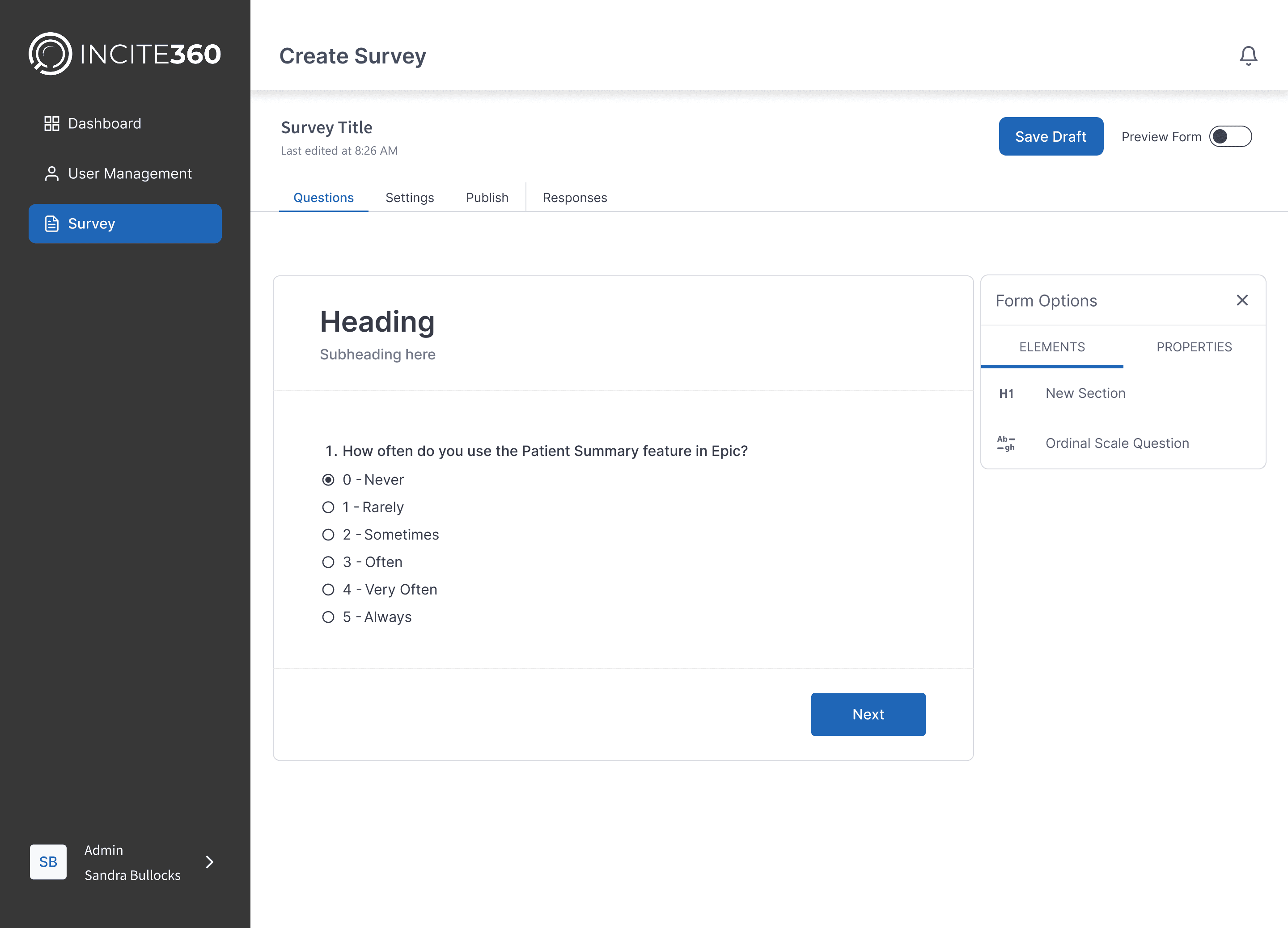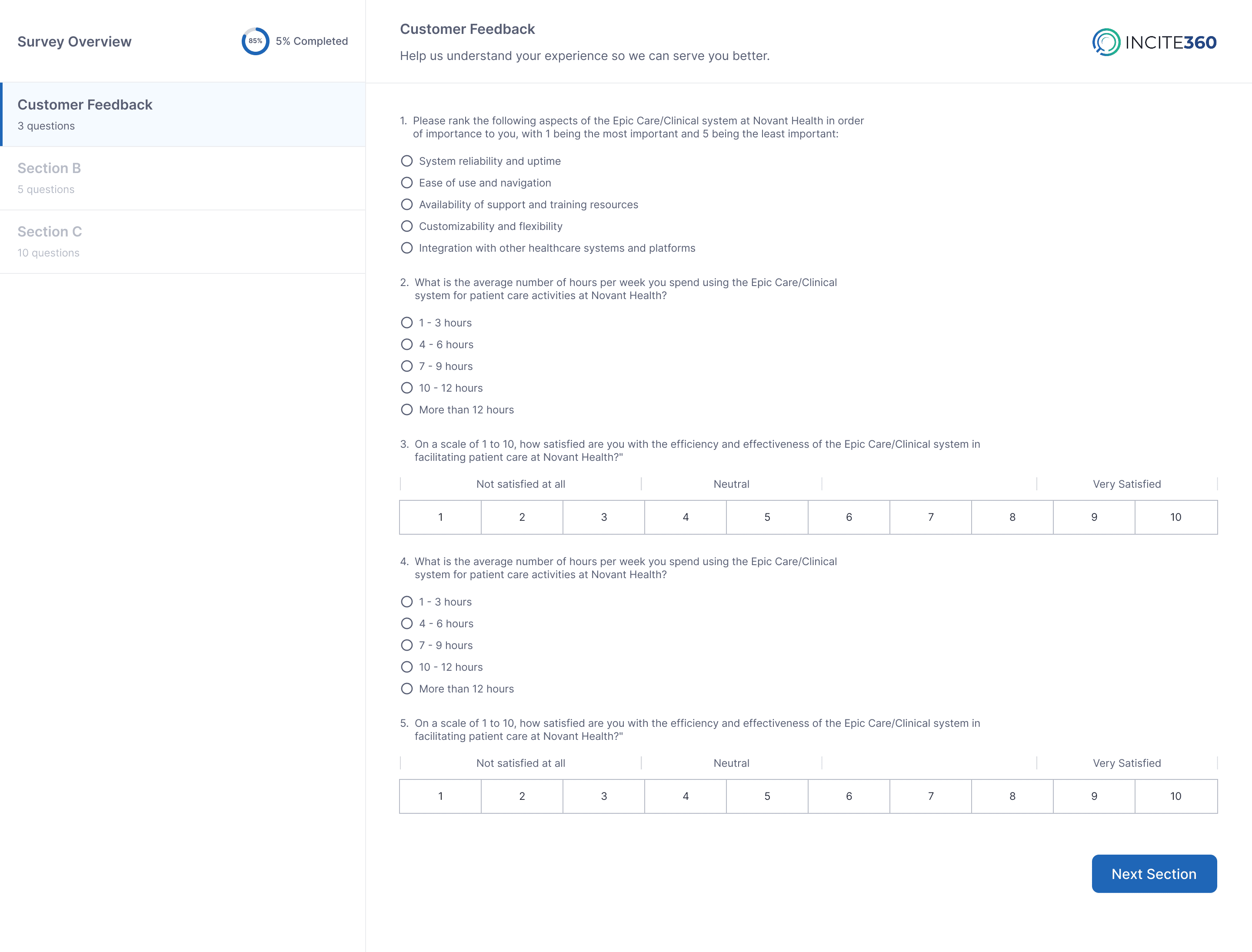 Because Incite360 aims to gather feedback from multiple sources and support many user roles, designing it required careful attention to complexity. One challenge was ensuring that survey creation remains simple and fast — even when supporting multiple question types (NPS, ordinal scales, open responses, etc.) and customizable templates. Another challenge was data handling: responses might come in high volumes, across channels, or include unstructured text. The UI had to represent aggregated data clearly (charts, sentiment word clouds, exportable reports) while staying performant.